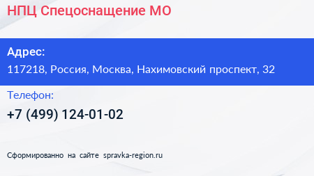 НПЦ Спецоснащение МО по адресу 117218, Россия, Москва, Нахимовский проспект, 32 в дальнейшем Организация, размещена в следующих категориях: