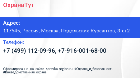 ОхранаТут по адресу 117545, Россия, Москва, Подольских Курсантов, 3 ст2 в дальнейшем Организация, размещена в следующих категориях: