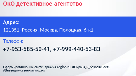 ОкО, детективное агентство по адресу 121351, Россия, Москва, Полоцкая, 6 к1 в дальнейшем Организация, размещена в следующих категориях: