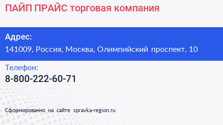 ПАЙП-ПРАЙС, торговая компания по адресу 141009, Россия, Москва, Олимпийский проспект, 10 в дальнейшем Организация, размещена в следующих категориях: