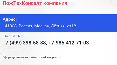 ПожТехКонсалт, компания по адресу 141008, Россия, Москва, Лётная, ст19 в дальнейшем Организация, размещена в следующих категориях: