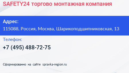 SAFETY24, торгово-монтажная компания по адресу 115088, Россия, Москва, Шарикоподшипниковская, 13 в дальнейшем Организация, размещена в следующих категориях:
