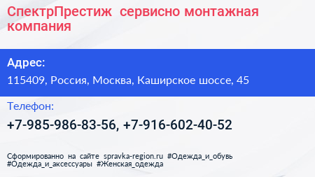СпектрПрестиж+, сервисно-монтажная компания по адресу 115409, Россия, Москва, Каширское шоссе, 45 в дальнейшем Организация, размещена в следующих категориях: