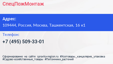 СпецПожМонтаж по адресу 109444, Россия, Москва, Ташкентская, 16 к1 в дальнейшем Организация, размещена в следующих категориях: