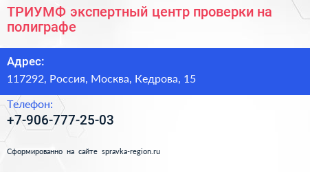 ТРИУМФ, экспертный центр проверки на полиграфе по адресу 117292, Россия, Москва, Кедрова, 15 в дальнейшем Организация, размещена в следующих категориях: