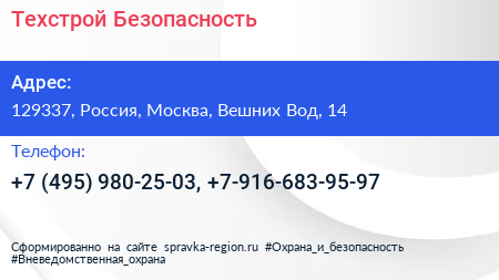 Техстрой Безопасность по адресу 129337, Россия, Москва, Вешних Вод, 14 в дальнейшем Организация, размещена в следующих категориях: