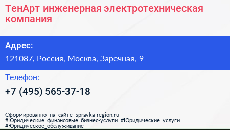 ТенАрт, инженерная электротехническая компания по адресу 121087, Россия, Москва, Заречная, 9 в дальнейшем Организация, размещена в следующих категориях: