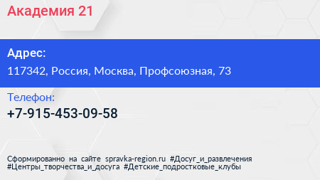 Академия 21 по адресу 117342, Россия, Москва, Профсоюзная, 73 в дальнейшем Организация, размещена в следующих категориях: