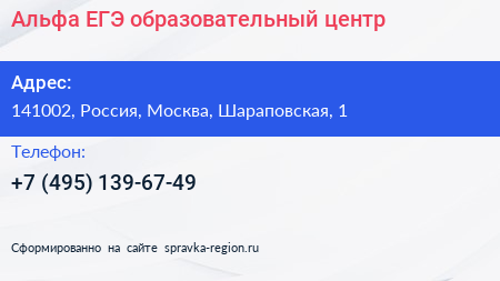 Альфа-ЕГЭ, образовательный центр по адресу 141002, Россия, Москва, Шараповская, 1 в дальнейшем Организация, размещена в следующих категориях: