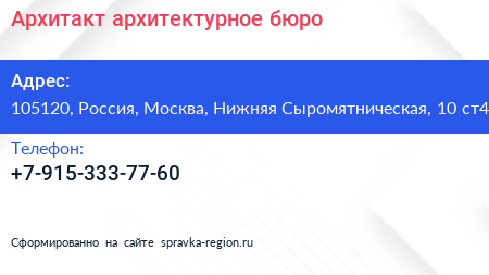 Архитакт, архитектурное бюро по адресу 105120, Россия, Москва, Нижняя Сыромятническая, 10 ст4 в дальнейшем Организация, размещена в следующих категориях: