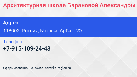 Архитектурная школа Барановой Александры по адресу 119002, Россия, Москва, Арбат, 20 в дальнейшем Организация, размещена в следующих категориях: