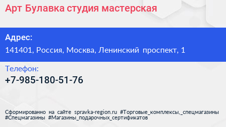 Арт Булавка, студия-мастерская по адресу 141401, Россия, Москва, Ленинский проспект, 1 в дальнейшем Организация, размещена в следующих категориях: