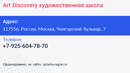 Art Discovery, художественная школа по адресу 117556, Россия, Москва, Чонгарский бульвар, 7 в дальнейшем Организация, размещена в следующих категориях: