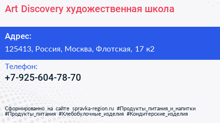 Art Discovery, художественная школа по адресу 125413, Россия, Москва, Флотская, 17 к2 в дальнейшем Организация, размещена в следующих категориях: