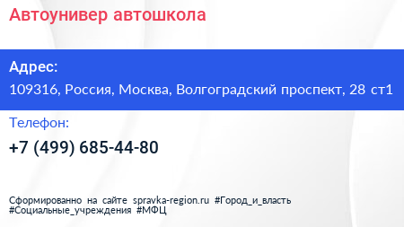 Автоунивер, автошкола по адресу 109316, Россия, Москва, Волгоградский проспект, 28 ст1 в дальнейшем Организация, размещена в следующих категориях: