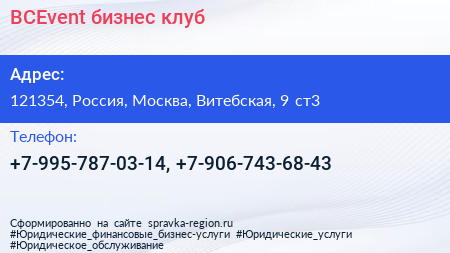 BCEvent, бизнес-клуб по адресу 121354, Россия, Москва, Витебская, 9 ст3 в дальнейшем Организация, размещена в следующих категориях: