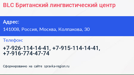 BLC, Британский лингвистический центр по адресу 141008, Россия, Москва, Колпакова, 30 в дальнейшем Организация, размещена в следующих категориях: