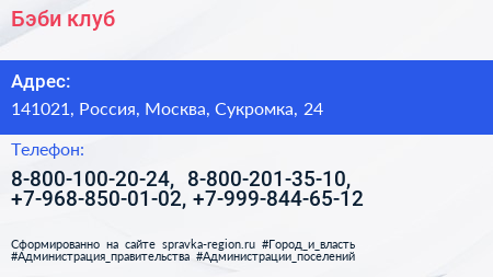 Бэби-клуб по адресу 141021, Россия, Москва, Сукромка, 24 в дальнейшем Организация, размещена в следующих категориях: