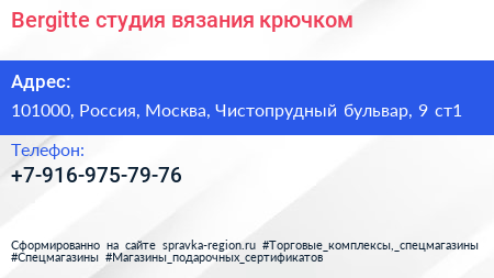 Bergitte, студия вязания крючком по адресу 101000, Россия, Москва, Чистопрудный бульвар, 9 ст1 в дальнейшем Организация, размещена в следующих категориях: