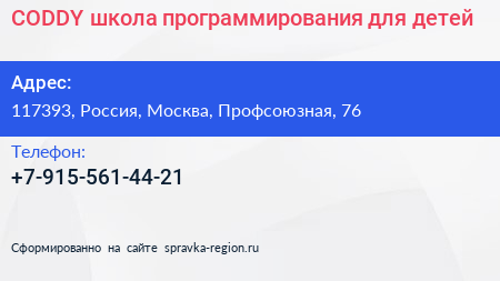 CODDY, школа программирования для детей по адресу 117393, Россия, Москва, Профсоюзная, 76 в дальнейшем Организация, размещена в следующих категориях: