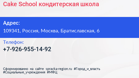 Cake School, кондитерская школа по адресу 109341, Россия, Москва, Братиславская, 6 в дальнейшем Организация, размещена в следующих категориях:
