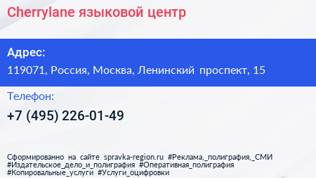 Cherrylane, языковой центр по адресу 119071, Россия, Москва, Ленинский проспект, 15 в дальнейшем Организация, размещена в следующих категориях: