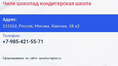Чили шоколад, кондитерская школа по адресу 115162, Россия, Москва, Хавская, 18 к2 в дальнейшем Организация, размещена в следующих категориях: