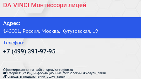DA VINCI, Монтессори-лицей по адресу 143001, Россия, Москва, Кутузовская, 19 в дальнейшем Организация, размещена в следующих категориях: