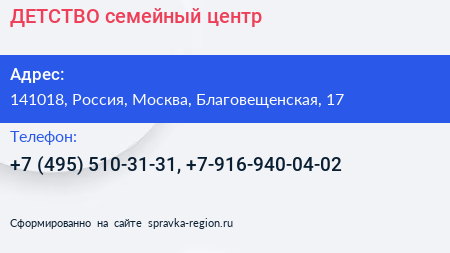 ДЕТСТВО, семейный центр по адресу 141018, Россия, Москва, Благовещенская, 17 в дальнейшем Организация, размещена в следующих категориях: