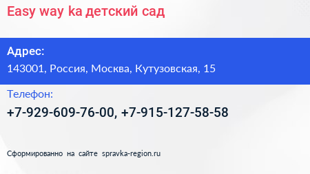 Easy way-ka, детский сад по адресу 143001, Россия, Москва, Кутузовская, 15 в дальнейшем Организация, размещена в следующих категориях: