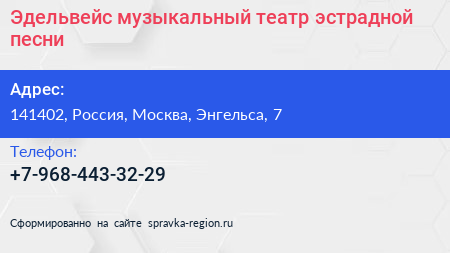 Эдельвейс, музыкальный театр эстрадной песни по адресу 141402, Россия, Москва, Энгельса, 7 в дальнейшем Организация, размещена в следующих категориях: