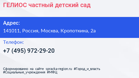 ГЕЛИОС, частный детский сад по адресу 141011, Россия, Москва, Кропоткина, 2а в дальнейшем Организация, размещена в следующих категориях: