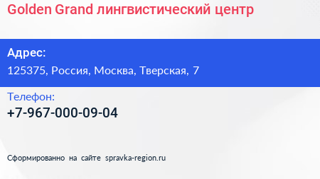 Golden Grand, лингвистический центр по адресу 125375, Россия, Москва, Тверская, 7 в дальнейшем Организация, размещена в следующих категориях: