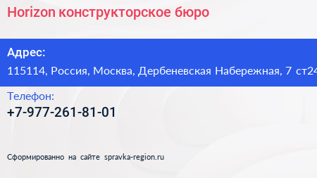Horizon, конструкторское бюро по адресу 115114, Россия, Москва, Дербеневская Набережная, 7 ст24 в дальнейшем Организация, размещена в следующих категориях: