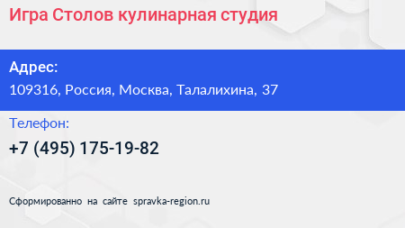 Игра Столов, кулинарная студия по адресу 109316, Россия, Москва, Талалихина, 37 в дальнейшем Организация, размещена в следующих категориях: