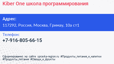 Kiber One, школа программирования по адресу 117292, Россия, Москва, Гримау, 10а ст1 в дальнейшем Организация, размещена в следующих категориях: