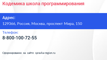 Кодемика, школа программирования по адресу 129366, Россия, Москва, проспект Мира, 150 в дальнейшем Организация, размещена в следующих категориях: