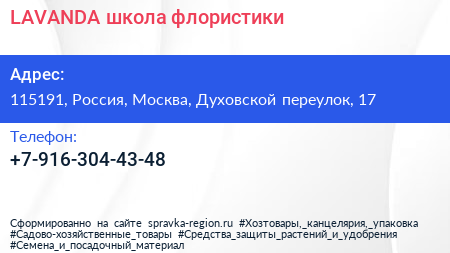 LAVANDA, школа флористики по адресу 115191, Россия, Москва, Духовской переулок, 17 в дальнейшем Организация, размещена в следующих категориях: