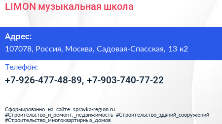 LIMON, музыкальная школа по адресу 107078, Россия, Москва, Садовая-Спасская, 13 к2 в дальнейшем Организация, размещена в следующих категориях: