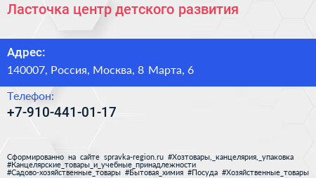 Ласточка, центр детского развития по адресу 140007, Россия, Москва, 8 Марта, 6 в дальнейшем Организация, размещена в следующих категориях: