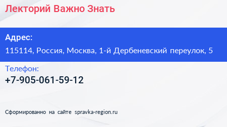 Лекторий Важно Знать по адресу 115114, Россия, Москва, 1-й Дербеневский переулок, 5 в дальнейшем Организация, размещена в следующих категориях: