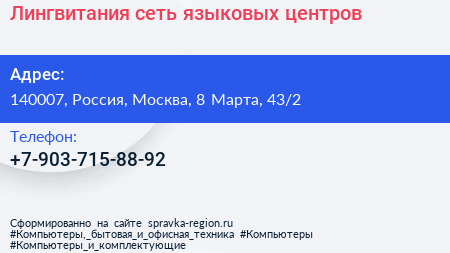 Лингвитания, сеть языковых центров по адресу 140007, Россия, Москва, 8 Марта, 43/2 в дальнейшем Организация, размещена в следующих категориях: