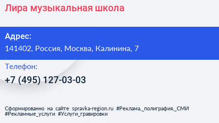 Лира, музыкальная школа по адресу 141402, Россия, Москва, Калинина, 7 в дальнейшем Организация, размещена в следующих категориях: