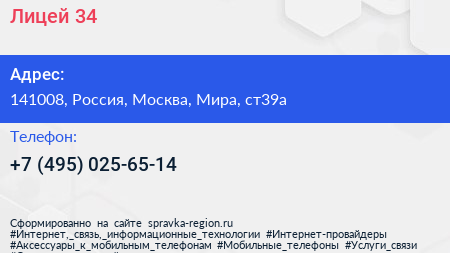 Лицей №34 по адресу 141008, Россия, Москва, Мира, ст39а в дальнейшем Организация, размещена в следующих категориях: