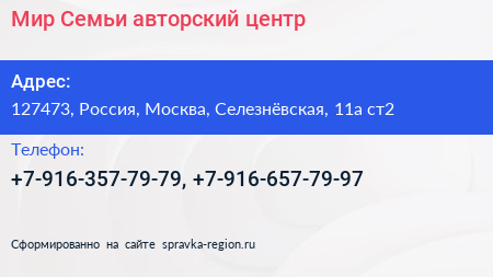 Мир Семьи, авторский центр по адресу 127473, Россия, Москва, Селезнёвская, 11а ст2 в дальнейшем Организация, размещена в следующих категориях: