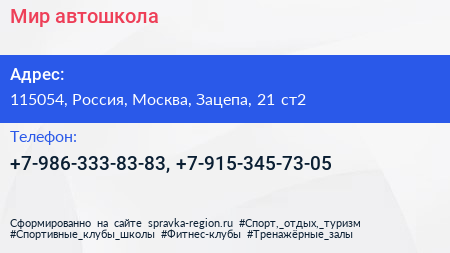 Мир, автошкола по адресу 115054, Россия, Москва, Зацепа, 21 ст2 в дальнейшем Организация, размещена в следующих категориях: