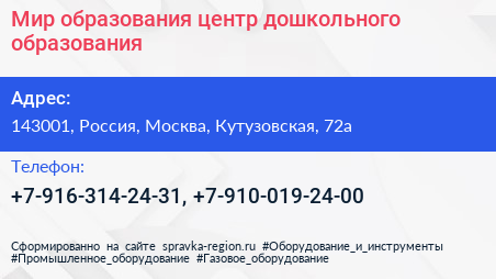 Мир образования, центр дошкольного образования по адресу 143001, Россия, Москва, Кутузовская, 72а в дальнейшем Организация, размещена в следующих категориях: