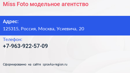 Miss Foto, модельное агентство по адресу 125315, Россия, Москва, Усиевича, 20 в дальнейшем Организация, размещена в следующих категориях: