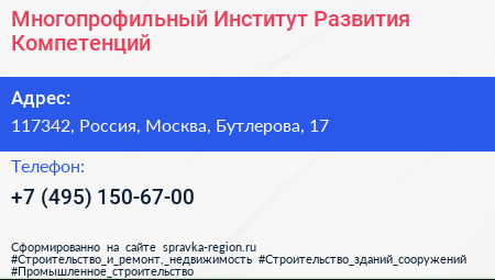 Многопрофильный Институт Развития Компетенций по адресу 117342, Россия, Москва, Бутлерова, 17 в дальнейшем Организация, размещена в следующих категориях: