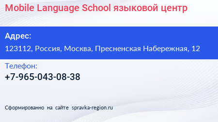 Mobile Language School, языковой центр по адресу 123112, Россия, Москва, Пресненская Набережная, 12 в дальнейшем Организация, размещена в следующих категориях: